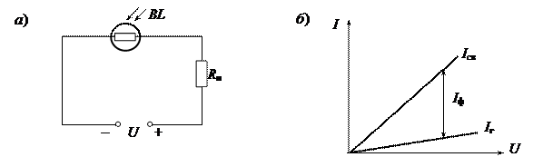 Рис. 8.7. Фоторезистор: а) – схема соединения; б) – вольтамперная характеристика