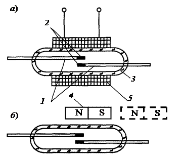 Герконовое реле. Если вместо постоянного магнита на стеклянную колбу 3 геркона расположить обмотку управления постоянного тока 4 (рис. 8.10, а), то при включении реле по обмотке катушки будет протекать ток, образуется магнитное поле, которое намагничивает контакты 1, в результате чего они притягиваются друг к другу и при этом замыкают цепь управления.