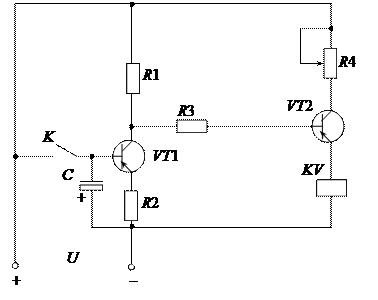 В исходном положении контакт K замкнут, конденсатор С будет заряжаться с полярностью показанной на рис. 8.15. Команда на начало отсчета времени подается при размыкании управляющего контакта K.