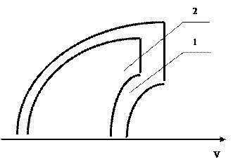 В последние годы был проведен ряд исследований в аэродинамических трубах и летные испытания различных устройств с целью разработки альтернативных способов подвески боевой нагрузки и выявления возможности уменьшения их влияния на летно-технические характеристики самолетов. Один из способов подвески боевой нагрузки, который может найти применение на самолетах будущего поколения, получил название конформного, или полуутопленного, заключающейся в том, что на протяжении всего фюзеляжа самолета устанавливается неглубокий грузовой поддон высота которого определяется высотой используемых держателей с таким расчетом, чтобы подвешенное оружие касалось нижней поверхности поддона. Так, при конформной подвеске 12 авиабомб калибра 227 кг в четыре ряда по три в каждом ряду общее лобовое сопротивление самолета уменьшается на 60% и почти на 50% увеличивается радиус действия самолета по сравнению с обычной подвеской. На рисунке 1.6 приведена выеотно-скоростная характеристика самолета при двух вариантах подвески (I - обычная подвеска на многозамковых держателях; 2 - конформная подвеска).