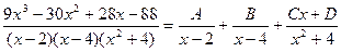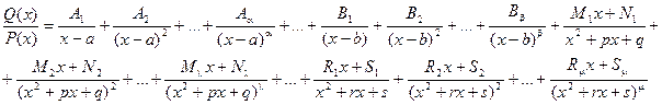 - правильная рациональная дробь, знаменатель P(x) которой представлен в виде произведения линейных и квадратичных множителей (отметим, что любой многочлен с действительными коэффициентами может быть представлен в таком виде: P(x) = (x - a)a…(x - b)b(x2 + px + q)l…(x2 + rx + s)m ), то эта дробь может быть разложена на элементарные по следующей схеме: