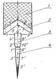 По мере приближения к оси облицовки кумулятивной выемки происходит увеличение толщины поперечного сечения обжатой облицовки. Таким образом, металлическая облицовка, имея вначале форму воронки, как бы схлопывается, стекаясь к оси выемки. При схлопывании облицовки вдоль ее оси частицы металла внутренней поверхности облицовки выплескиваются в сторону основания выемки с очень большой скоростью, образуя тонкую металлическую струю. Основная же часть материала облицовки образует в хвостовой части струи сравнительно медленно движущийся утолщенный металлический стержень — так называемый пест. Точками на рисунке 8.3 условно показано распределение металла облицовки в кумулятивной струе и песте. Так из металла в точках 5 и 6 облицовки образуются головная часть струи 5` и хвостовая часть песта 6'. Металл из точек 1 2, 9 и 10 облицовки переходит соответственно в хвост струи (точки 1', 9') и голову песта (точки 2`, 10'). Распределение металла облицовки между кумулятивной струей и пестом связано с текучестью металла. Этот факт подтвержден опытным путем, в котором на внутреннюю или наружную поверхности стального конуса гальваническим путем наносился тонкий слой меди. После взрыва такого заряда медь обнаруживалась соответственно либо только в струе, либо только в песте, что являлось подтверждением характера распределения металла облицовки.