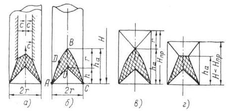 В таком заряде волны разрежения, которые определяют разлет продуктов детонации заряда ВВ, движутся в глубь заряда со всех его поверхностен одновременно и с одинаковой скоростью С. На рисунке. 8.5a, показано текущее положение фронтов волн разряжения в некоторый момент времени. Ясно, что геометрическим местом точек их пересечения является линия АВ и ВС (рисунок 8.5,6). Каждая точка D, принадлежащая этой кривой, находится на равном удалении от соответствующих поверхностей заряда. Таким образом, активная часть заряда ограничена объемом с сечением АВСО, примыкающим непосредственно к выемке. Поскольку волны разрежения, движущиеся от вершины выемки О и боковой поверхности заряда, к моменту их встречи проходят одинаковые расстояния, равные радиусу заряда