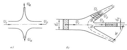 .. На практике могут иметь место два случая. Если диаметры струй и скорости движения жидкости в них одинаковы, то в процессе их соударения пелена образуется в плоскости, перпендикулярной осям струй (рис. 8.7,а). Если же при одной и той же скорости