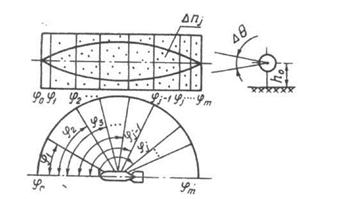 При взрыве ЬЧ образуется осколочное поле — поток осколков, характеризующихся направлением и скоростью движения, а также плотностью, т. е. количеством осколков, приходящихся единицу той площади, которую они пересекают. Плотность потока осколков является одной из важнейших характеристик, определяющих возможность попадания осколков в цель. Так как сама цель в общем случае может находиться под совершенно произвольным направлением по отношению к оси БЧ, то при решении задачи по определению вероятности попадания осколков в цель необходимо прежде всего знать, сколько вообще осколков летит в данном направлении. Ответ на данный вопрос дает так называемый закон разлета осколков. Он представляет собой зависимость относительного числа осколков, летящих в заданном направлении относительно оси БЧ. Обычно это направление задается в сферической системе координат двумя углами - углом