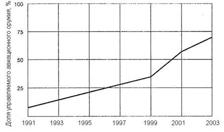 Управляемые авиационные бомбы(УАБ)являются одним из представительных видов высокоточного оружия, поскольку они сочетают в себе высокую точность попадания, мощность боевой части (БЧ) и относительно низкую стоимость. Об этом свидетельствуют статистические данные о повышении доли использования управляемых авиационных бомб в локальных конфликтах. Так, если во время войны во Вьетнаме и в Юго-Восточной Азии (1966-1975 гг.) в период бомбардировок 1966-1973 гг. эта доля составляла около 1 %, то в период боевых действий многонациональных сил против Ирака в 1991 г. (операция "Буря в пустыне") она возросла до 8 %, достигнув уже -35 % при проведении операции стран НАТО "Решительная сила" против Югославии с 24 марта по 20 июня 1999 г. и -70 % во время боевых действий США и их союзников против Ирака в 2003 г. (рисунок 10.14).