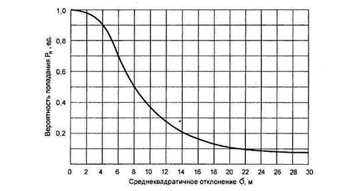 Но прежде чем перейти к этому вопросу, рассмотрим влияние ошибки наведения УАБ (или любого боеприпаса) на вероятность поражения малоразмерной цели (рисунок 10.16) Чтобы обеспечить вероятность попадания в малоразмерную цель не менее 0,8, необходимо иметь ошибку наведения авиационного боеприпаса не более а = 5 м (а - среднеквадратичное отклонение, круговое вероятное отклонение Екво = 1,177а). Для современного ВТО ошибка наведения а = 3 м считается стандартом.