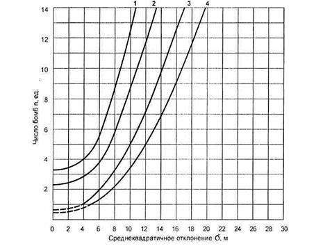 Из рисунка 10.17 видно, что число бомб, необходимых для поражения малоразмерной цели с заданной вероятностью, резко возрастает, если боеприпас имеет ошибку наведения более 5 м. Эффективность действия БЧ по данной цели и ошибка наведения боеприпаса взаимосвязаны, что определяется на этапе конструирования и отработки боеприпаса.