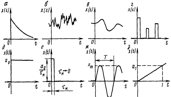 Как отмечалось выше, САР имеет место управляющие (задающие) и возмущающие воздействия, в результате действия которых в системе возникает переходной процесс, приводящий систему к новому установившемуся состоянию. В реальных условиях воздействия могут иметь произвольный характер. Для исследования динамических свойств элементов и систем выбирают такие типовые воздействия, которые по возможности близко отражали бы наиболее существенные особенности реальных воздействий. Такими воздействиями могут быть либо наиболее вероятные, либо наиболее неблагоприятные воздействия. Причем их можно разделить на регулярные и случайные, непрерывные и дискретные.