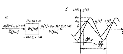Частотными характеристиками называются зависимости, связывающие входную и выходную величины линейной системы в установившемся режиме, когда входное воздействие изменяется по гармоническому закону x(t) = a sin wt с частотой и постоянной амплитудой a. На выходе системы после завершения переходного процесса устанавливается синусоидальные колебания y(t) = b sin(wt + j). На комплексной плоскости входная и выходная величин для каждого момента времени t определены векторами а и b.
