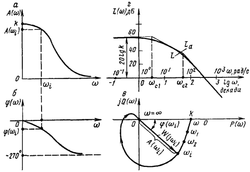 Если амплитуду колебаний входной величины оставить неизменной, а изменять частоту w от нуля до ¥, то каждому значению частоты будут соответствовать определенные значения амплитуды колебаний b и сдвига фазы j на выходе системы. Это значит, что отношение амплитуд и разность фаз являются функциями частоты, т.е:
