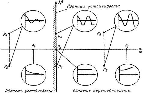 Рис. 4.1. Влияние корней характеристического уравнения системы на составляющие ее свободного движения