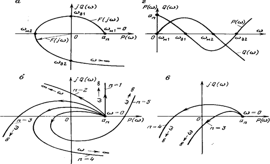 Характеристические кривые, соответствующие устойчивым системам (рис. 4.2, б), имеют плавную спиралеобразную форму и уходят в бесконечность в том квадранте, номер которого равен порядку уравнения. Если характеристическая кривая проходит п квадрантов не последовательно или проходит меньшее число квадрантов, то система неустойчива (рис. 4.2, в).