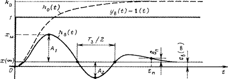 Для переходных процессов, вызванных возмущающим воздействием у в на входе объекта (см. рис. 5.2, б), перерегулирование можно определять как отношение второго (отрицательного) максимального отклонения А 2 к первому максимальному отклонению A 1: