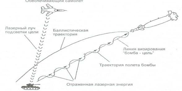 В этом случае вектор скорости бомбы и направление, с которого приходит отраженное лазерное излучение, должны совпадать. Наличие возмущений - турбулентность атмосферы, неточность углового сопровождения обеспечивающим самолетом - приводят к колебаниям УАБ относительно линии визирования цели и в значительной степени корректируются СУ.