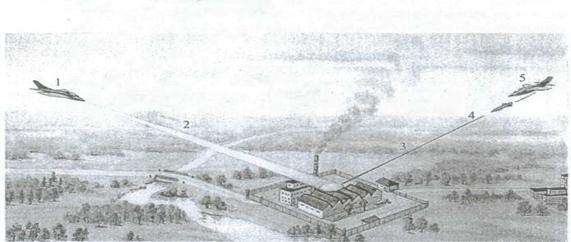 3 - отраженное излучение от цели, 4 - УАБ, 5 - самолет-носитель