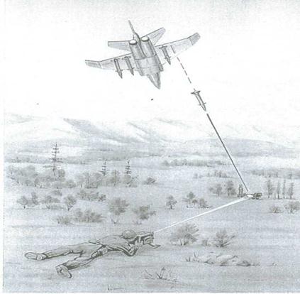 Подсветка цели лучом лазера может производится либо непосредственно с самолета-носителя, осуществляющего бомбометание (рисунок 10.31), либо с другого самолета (рисунки 10.32, 10.33, 10.34), либо с помощью наземного целеуказателя (рисунок 10.25).