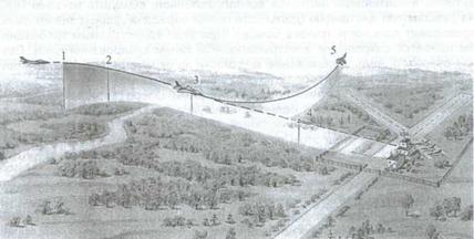 1 - выход в район цели; 2 - обнаружение и распознавание цели; 3 - сброс УАБ; 4 - автономное наведение УАБ на цель; 5 - выход самолета из зоны атаки цели