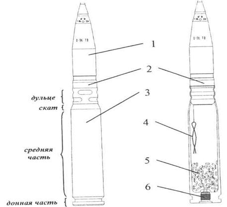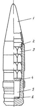 1 — снаряд; 2 — ведущий поясок; 3 — гильза; 4 — размеднитель; 5 — пороховой заряд; 6 — воспламенительное устройство