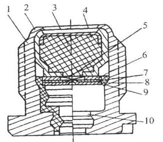 1 - корпус; 2 - колпачок; 3 - воспламенительный состав; 4 - чашечка; 5 - мостик накаливания; 6 - контакт верхний (кольцо); 7 - шайба изоляционная; 8 - контакт нижний (шайба); 9- изолятор пластмассовый; 10 - контакт центральный