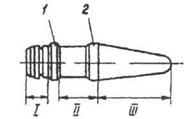 1 — ведущий поясок, 2 — центрирующее утолщение I — хвостовая или запоясковая часть, II — цилиндрическая часть, III — головная часть