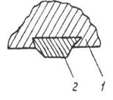 Материалом для изготовления ведущих поясков традиционно служит красная электролитическая медь, обладающая хорошими пластическими свойствами. Ведущий поясок изготавливается запрессовкой меди в специальную кольцевую проточку на корпусе снаряда, которая в сечении имеет форму «ласточкина» хвоста (рисунок 12.4). Для лучшего сцепления пояска с корпусом снаряда и исключения проворачивания пояска дно проточки наносится накатка с продольными ребрами.