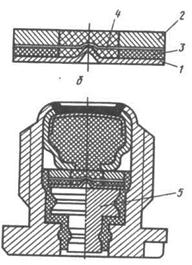 На рисунке 12.12, приведена конструкция электрокапсюльной втулки. Электровоспламенительное устройство состоит из двух дисковых контактов: нижнего 1 и верхнего 2, изолированных друг от друга шайбой 3. Нихромовая проволочка находится между верхним контактом 2 и шайбой 3. Выштамповка (горбик) на нижнем контакте касается середины проволочки, при этом образуются два мостика накаливания 4. Пространство вокруг проволочки заполнено тринитрорезерцинатом свинца (ТНРС), чувствительным к тепловому импульсу.