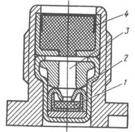 Он состоит из латунного колпачка У, внутри которого под давлением 110...40 МПа запрессован чувствительный к удару состав 2, прикрытый сверху кружок оловянной фольги. Внутренняя поверхность колпачка покрывается щелочным лаком для предотвращения взаимодействия ударного состава с материалом колпачка. Поверхность фольги, обращенная к ударному составу, также лакируется для улучшения сцепления ее с ударным составом. Герметичность состава обеспечивается лакировкой стыка фольги со стенкой колпачка.