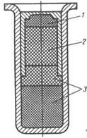 На рисунке 12.14 приведена конструкция капсюля-детонатора лучевого действия. Его снаряжение состоит из трех взрывчатых веществ. Верхний слой 1 — ТНРС — инициирующее ВВ, высоко чувствительное к лучу огня, но обладающее сравнительно низкой инициирующей способностью.