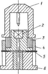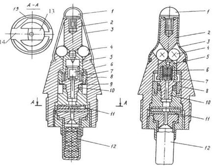 Конструкция капсюля-детонатора накольного действия показана на рисунке 12.15. Капсюль также снаряжен тремя различными ВВ: накольным составом 7, азидом свинца 2 и тетрилом 3. Нахальный состав отличается от применяемых в капсюлях-воспламенителях и представляет смесь тетразена (инициирующее ВВ, обладающее высокой чувствительностью к наколу), ТНРС, нитрата бария и антимония. Средняя часть дна чашечки сделана более тонкой для уменьшения усилия проникания жала к накольному составу.