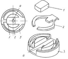 Предохранительное устройство типа «движок-заслонка» (рисунок 12.19) состоит из корпуса с направляющими пазами, движка и фиксатора. В корпусе предохранителя имеется центральное отверстие а, совпадающее с каналом огневой цепи.