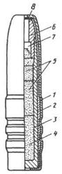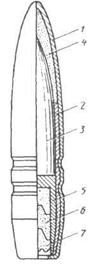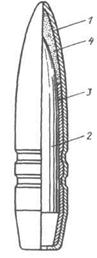 Оболочка пули 1 выполнена из биметалла: мягкой малоуглеродистой стали, плакированной томпаком. Томпак представляет собой сплав меди с цинком (соответственно 90% и 10%). Он предохраняет пулю от коррозии, а ствол от чрезмерного износа. Толщина оболочки составляет (0,05...0,08)d, а слоя плакировки — 0,01... 0,03 мм.