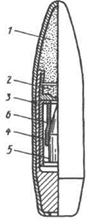 В головной части пули размещены зажигательный состав 1 и мощный капсюль-воспламенитель KB-11 (2). На цилиндрической части пули имеется свинцовая рубашка З, внутри которой находится биметаллический стаканчик 4 с простейшим ударным механизмом, состоящим из ударника 5 и предохранительного разрезного цилиндрика б.