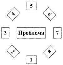 А теперь хотелось бы, чтобы мы посмотрели, как изменится наше представление о себе и окружающем, если мы начнем пользоваться картой НЛП – ее базовыми убеждениями. Напишем эти убеждения на отдельных карточках. И возьмем еще одну карточку, на которой написано «Проблема». Найдите, пожалуйста, ту проблему, которую не жалко решить... Готово? Разбились на пары, нашли в зале место, где удобно работать. Представили достаточно большой – 1,5 – 2 метра– круг. В центре его расположили «Проблему», а по окружности – карточки с убеждениями НЛП.