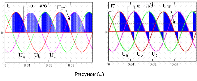Принцип действия ТП основан на том, что в положительный полупериод питающего напряжения тиристор, подобно ключу, открывается и подает напряжение к двигателю только часть этого полупериода (рисунок 8.3). При этом среднее выпрямленное напряжение на нагрузке UСР определяется углом задержки отпирания вентиля α, называемым углом управления.