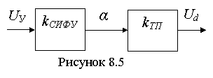 При анализе статических свойств ТП его структурную схему удобно представить в виде двух последовательно включенных звеньев (рисунок 9): системы импульсно-фазового управления (СИФУ) и собственно тиристорного преобразователя (силового блока). Входным сигналом СИФУ является напряжение управления Uу, которое преобразуется в угол регулирования тиристоров α и определяет среднее значение выпрямленного напряжения Ud