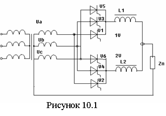 ток требуемой частоты выполняются в одном устройстве. Это обусловливает однократное преобразование энергии и высокое значение КПД, малые габариты и массу НПЧ. Они выполняются по тем же схемам, что и выпрямители (однофазные, многофазные, нулевые, мостовые). Для уяснения принципа преобразования на рисунке 10.1 приведена простейшая схема НПЧ, осуществляющего преобразование трехфазного напряжения промышленной частоты f1 в однофазное напряжение регулируемой частоты f2.