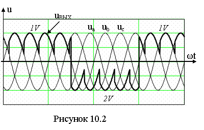положительная полуволна формируется при работе группы 1V, отрицательная – группы 2V. Выходное напряжениепреобразователя представляет собой огибающую фазных