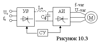 ПЧ со звеном постоянного тока можно подразделить на преобразователи с управляемым выпрямителем и автономными инверторами напряжения или тока (ПЧ с АИ – рисунок 10.3) и ПЧ с неуправляемым выпрямителем и широтно-импульсной модуляцией выпрямленного напряжения (ПЧ с ШИМ – рисунок 10.4).