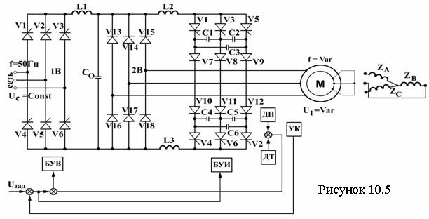 На рисунке 10.5 дана схема трехфазного преобразователя частоты с автономным инвертором, содержащего трехфазный мостовой управляемый выпрямитель 1В, дроссель фильтра Д1, конденсатор реактивной энергии С0 и автономный трехфазный мостовой инвертор напряжения с коммутирующими емкостями. Двигатель, питающийся от этого преобразователя, не может работать в генераторном режиме параллельно с сетью, т.к. выпрямитель 1В обладает односторонней проводимостью энергии. Для создания возможности генераторного режима необходимо включить встречно – параллельно выпрямителю 1В зависимый, ведомый сетью инвертор. Выпрямитель 1В собран на тиристорах V1-V6, диодах V7-V12, емкостях С1-С6. На блок – схеме обозначено: БУВ – блок управления выпрямителем, БУИ – блок управления инвертором, УК – устройство коррекции, ДН – датчик напряжения, ДТ – датчик тока.