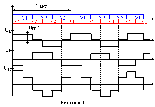 Линейное напряжение находится, как Uab=Ua-Ub. Полученная форма напряжения (рисунок 10.7) показывает, что напряжение питания в значительной степени отличается от синусоиды. Аналогичное построение для других фаз показывает, что на выходе сформирована трехфазная система напряжений, сдвинутых относительно друг друга на 120 эл. градусов.