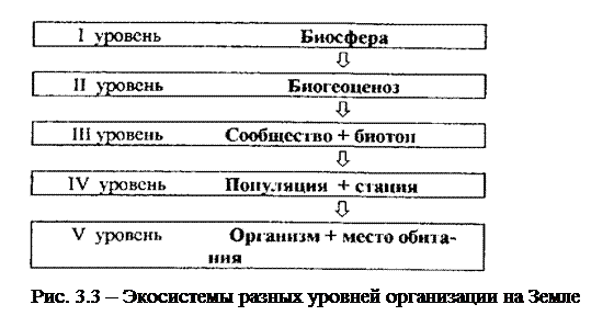 Переходная область между двумя смежными экосистемами называется экотон. Экосистема - сообщество живых организмов и среда их обитания, которые функционируют совместно, т. е. обмен вещества и энергии происходит в них во взаимной связи. Различают экосистемы различных уровней организации (см. рис. 3.3).