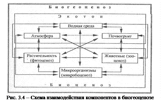 Сам термин «биогеоценоз» предложил В.Н. Сукачев, который понимал под ним «совокупность на известном протяжении земной поверхности однородных природных явлений – атмосферы, горной породы, гидрологических условий, растительности, животного мира, мира микроорганизмов и почвы». Для этой совокупности характерны специфические взаимодействия компонентов, их особые структура и тип обмена веществом и энергией (рис. 3.4).
