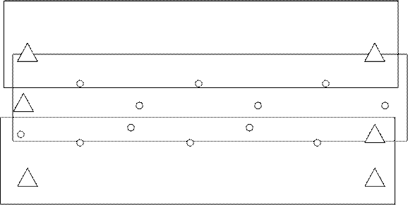 Блочная фототриангуляция по методу независимых маршрутов выполняется следующим образом. Сначала строят модели маршрутов по методике, изложенной в разделе 1.2, а затем объединяют их в блочную сеть по связующим точкам, расположенным в межмаршрутном перекрытии, с одновременным их внешним ориентированием по опорным точкам (рис.1.3.1):