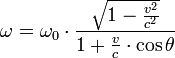 где с — скорость света, v — скорость источника относительно приёмника (наблюдателя), θ - угол между направлением на источник и вектором скорости в системе отсчёта приёмника. Если источник радиально удаляется от наблюдателя, то θ=0, если приближается - θ=π.