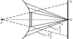 Таким образом, когда отверстие открывает нечетное число зон Френеля, то амплитуда (интенсивность) в точке М будет больше, чем при свободном распространении волны; если четное, то амплитуда (интенсивность) будет равна нулю, как показано на рис. 9.3.