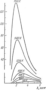 Рис. 1.9. Кривые распределения энергии в спектре черного тела для разных температур.
