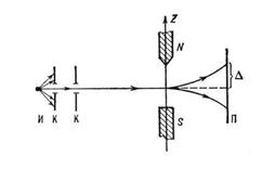 На атом, обладающий магнитным моментом и движущийся в неоднородном вдоль Z магнитном поле Н, действует сила F= mz дН/дZ, которая отклоняет его от первоначального направления движения. Если проекция магнитного момента атома могла бы изменяться непрерывно, то на пластинке П наблюдалась бы размытая широкая полоса. Однако в Ш.— Г. о. было обнаружено расщепление пучка атомов на 2 компоненты, симметрично смещенные относительно первичного направления распространения на величину D — на пластинке появлялись две узкие полосы. Это указывало на то, что проекция магнитного момента атома mz на направление поля Н принимает только два отличающиеся знаком значения ±mo, т. е. mo ориентируется вдоль Н и в противоположном направлении. Величина магнитного момента атома mо, измеренная в опыте по смещению D, оказалась равной Бора магнетону.