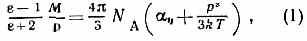 электронная поляризуемость молекул, NA —Авогадро постоянная. Л,— Д. ф.— обобщение Клаузиуса — Моссотти формулы на случай полярного диэлектрика. Электрич. поле E вызывает преимуществ. ориентацию дипольных моментов молекул вдоль поля, чему препятствует тепловое движение. Вычисление проекции постоянного дипольного момента молекулы на направление E позволяет определить т. н. ориентац. поляризуемость молекул, приближённо равную р^2/3kT. Учёт ориентац. поляризуемости приводит к Л.- Д. ф.