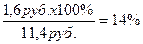 Допустим, посредник приобретает товар по цене 11,4руб. и реализует по цене 13 р. В абсолютном выражении = надбавка составит 13 р. – 11,4 = 1,6р,